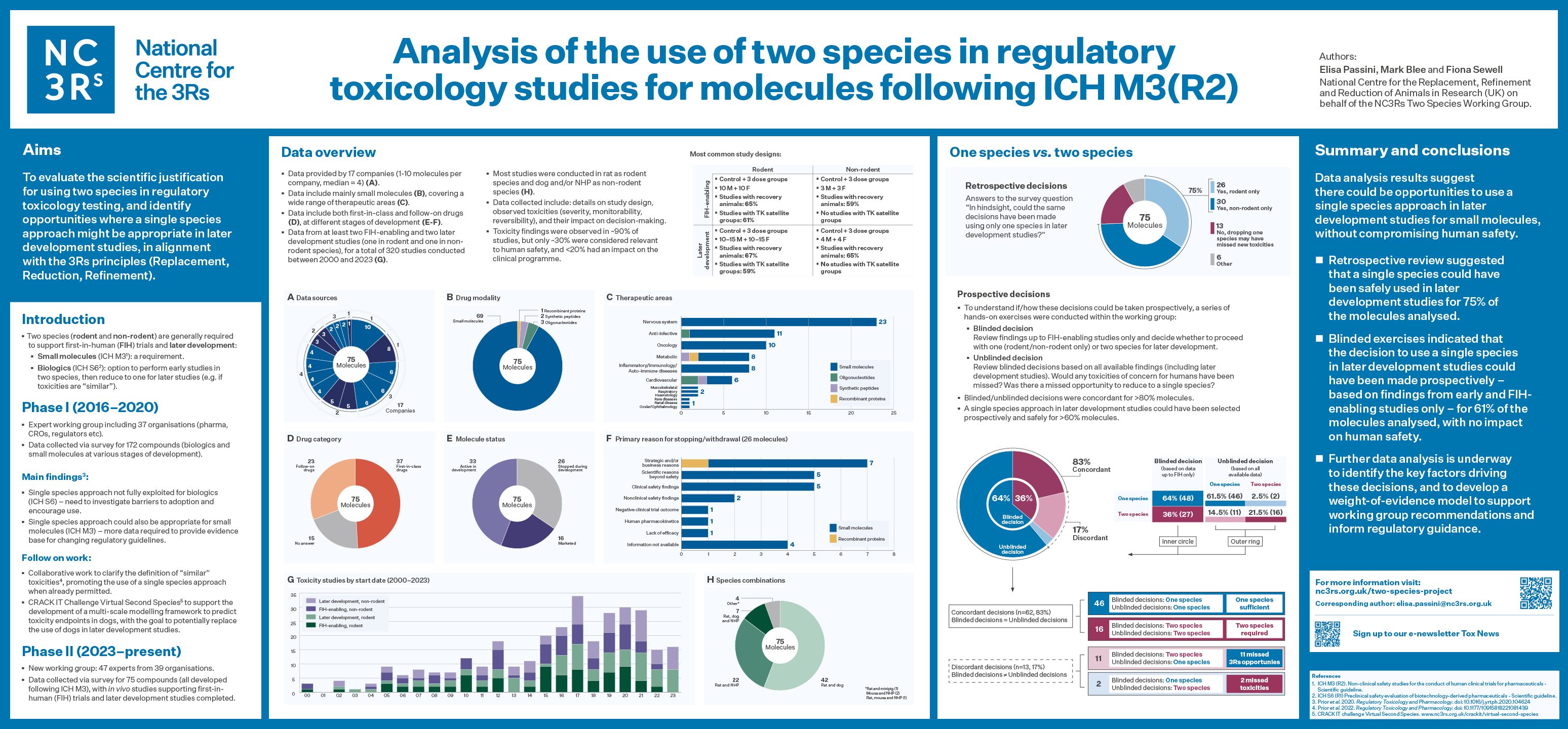 Previously, we have reviewed how and when two species are used within regulatory toxicology studies for molecules following the international ICH S6(R1) guidelines [2] for the development of biotechnology-derived pharmaceuticals (i.e. biologics). For these molecules, a single species can be used for longer-term studies if "similar" toxicities are identified in two species in short-term studies (i.e. supporting the first administration in humans). The evidence collected via survey highlighted opportunities for a single species approach to be used more widely for more molecules following ICH S6(R1), and provided preliminary evidence to support expanding this approach to nonclinical toxicology strategies for other drug modalities (i.e. molecules following ICH M3(R2)) [3]. However, it was recognised that changing the regulatory guidelines would require more robust evidence demonstrating minimal risk/impact for human risk assessment. This is why we decided to start a new phase to investigate these opportunities further.